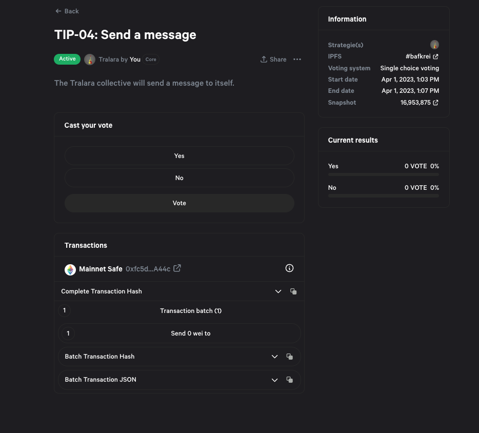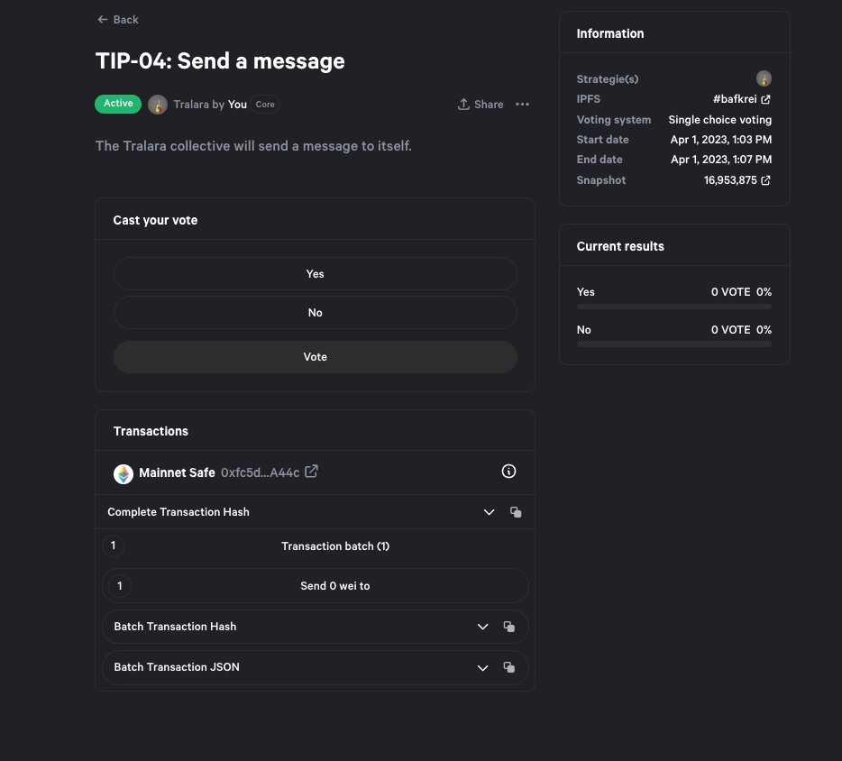 After the SafeSnap plugin is installed in your space, there will be an extra step when creating proposals, that will allow the creator of the proposal to propose a batch of transaction batches. After you do, a proposal like this will be created.