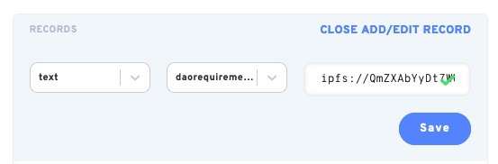 Go to the ENS frontend, access the ENS of the Snapshot Space, click on Add/Edit Record, and add a new record by selecting text on the left selector, typing in daorequirements in the right selector, and pasting the IPFS identifier.