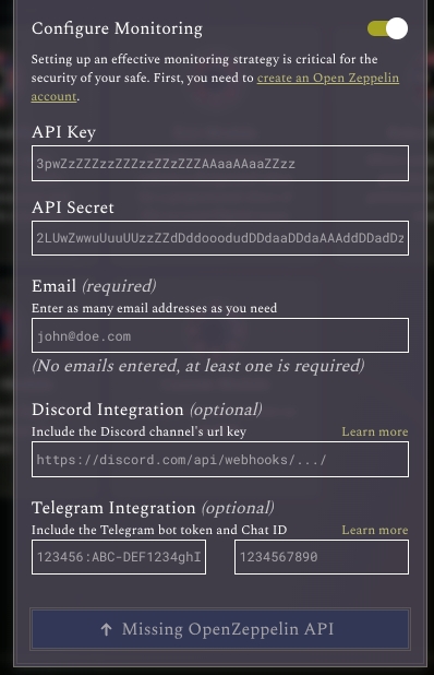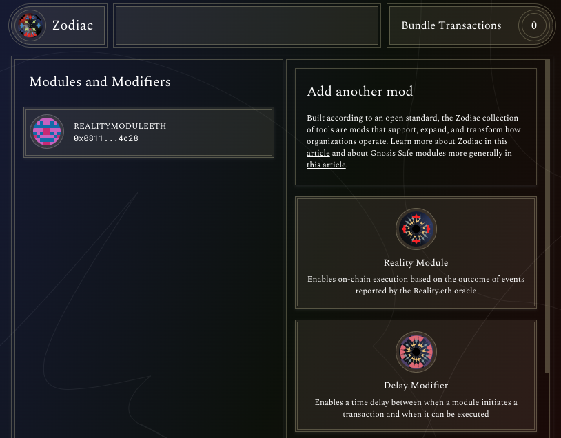 In realityAddress, paste in the address of the Reality Module. You can find this address in your Zodiac App. Check the screenshot below, the left side of the screen.