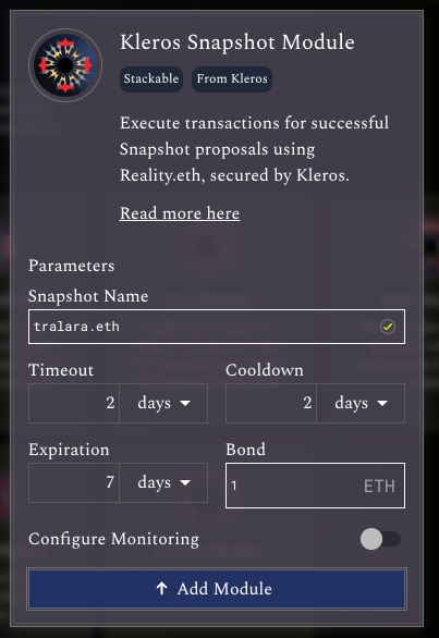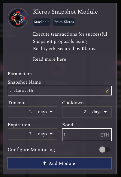 From the Zodiac app within the Safe app, you can deploy a Kleros Snapshot Module. This is a wrapper of the already existing Reality Module, and will automatically deploy it using Kleros as arbitrator. This module is available in Mainnet, Gnosis Chain, and Polygon.
