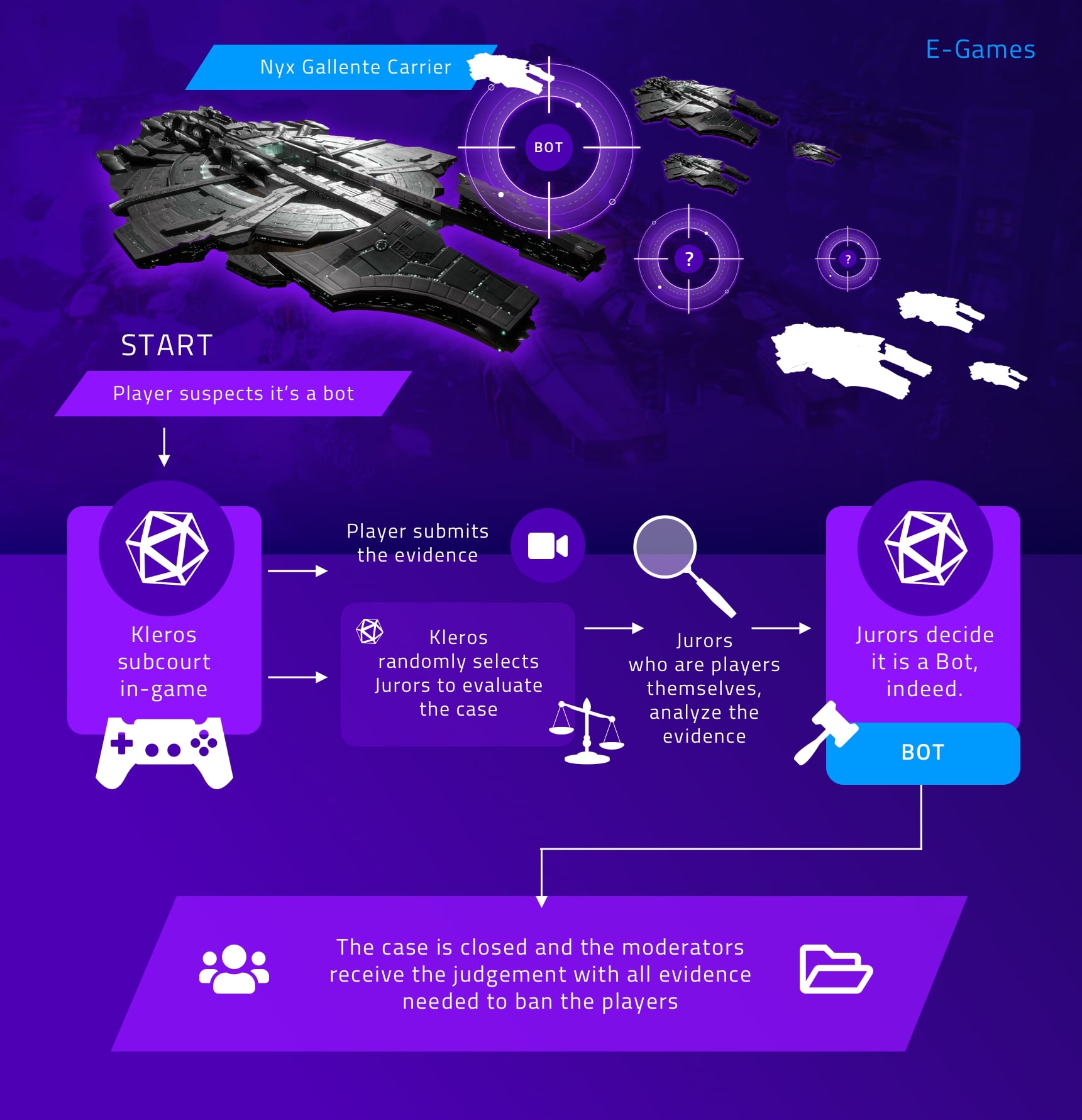 The player records these flight patterns and manages to divulge that what he uncovered is indeed a botting ring. He sends the information to the Kleros subcourt in-game and posts a deposit alongside the evidence gathered for other players to see. Jurors, who are players themselves, chosen at random analyze this data and can do further checking in-game to find more proof of this kind of breach.