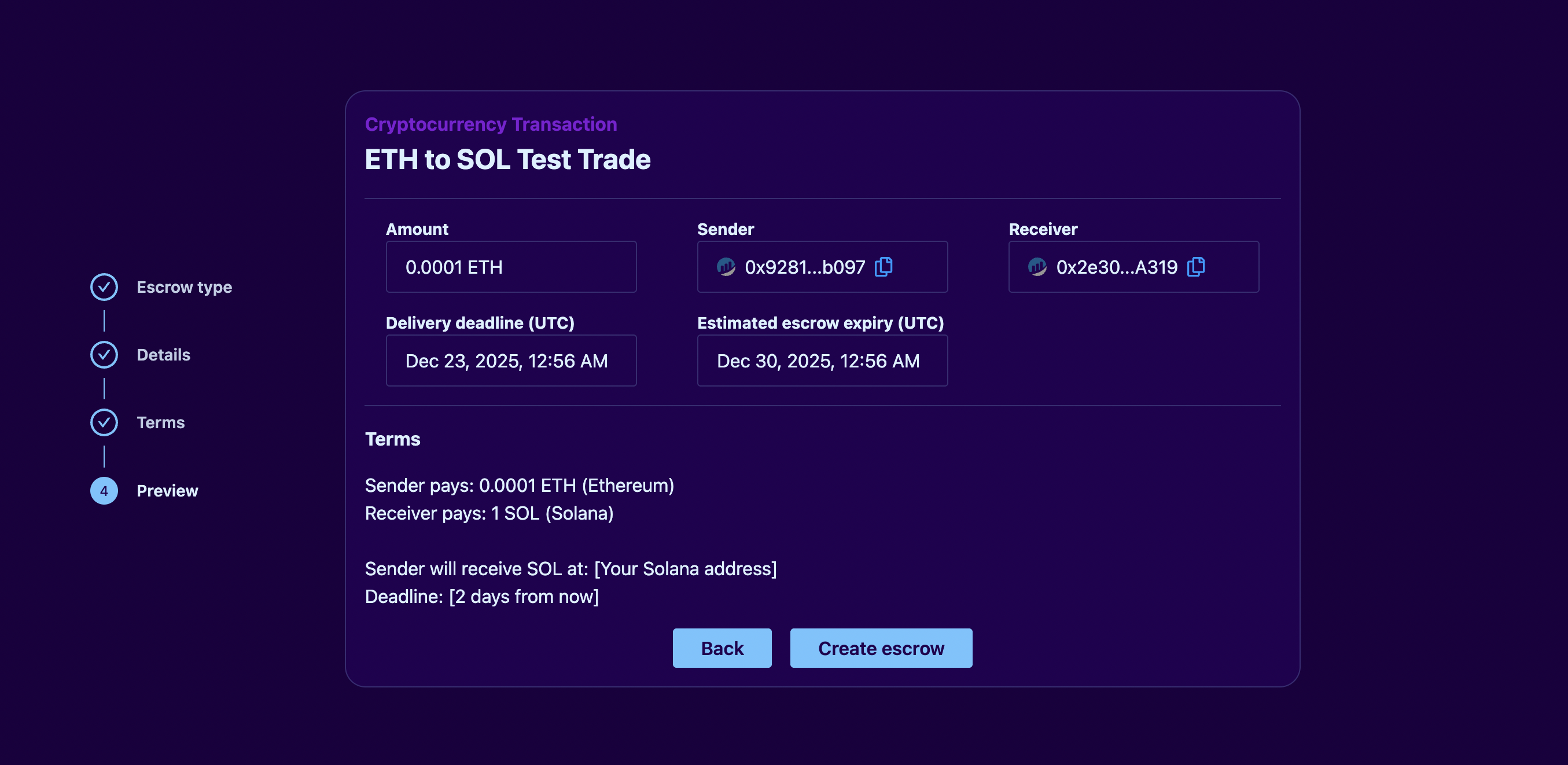 In this step, you will specify the details of the Escrow transaction to be made between parties and lock the funds in the Escrow.