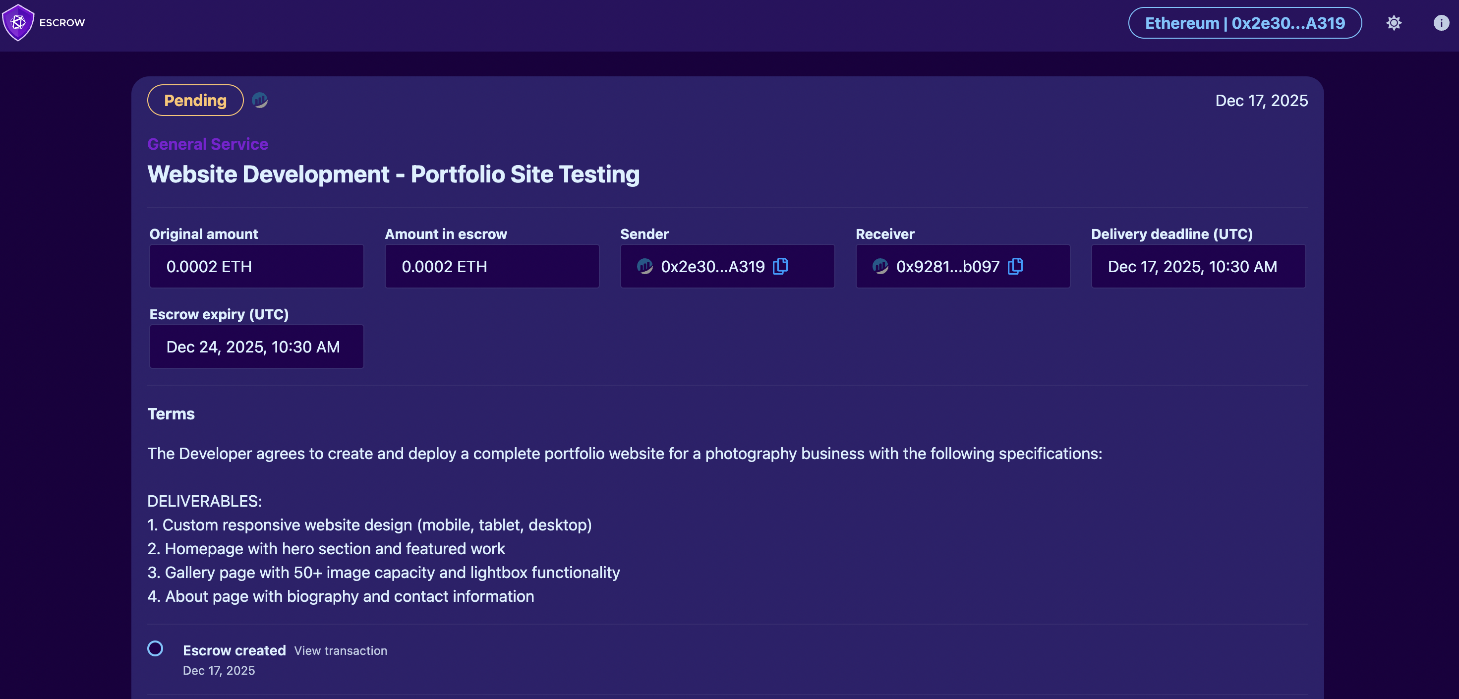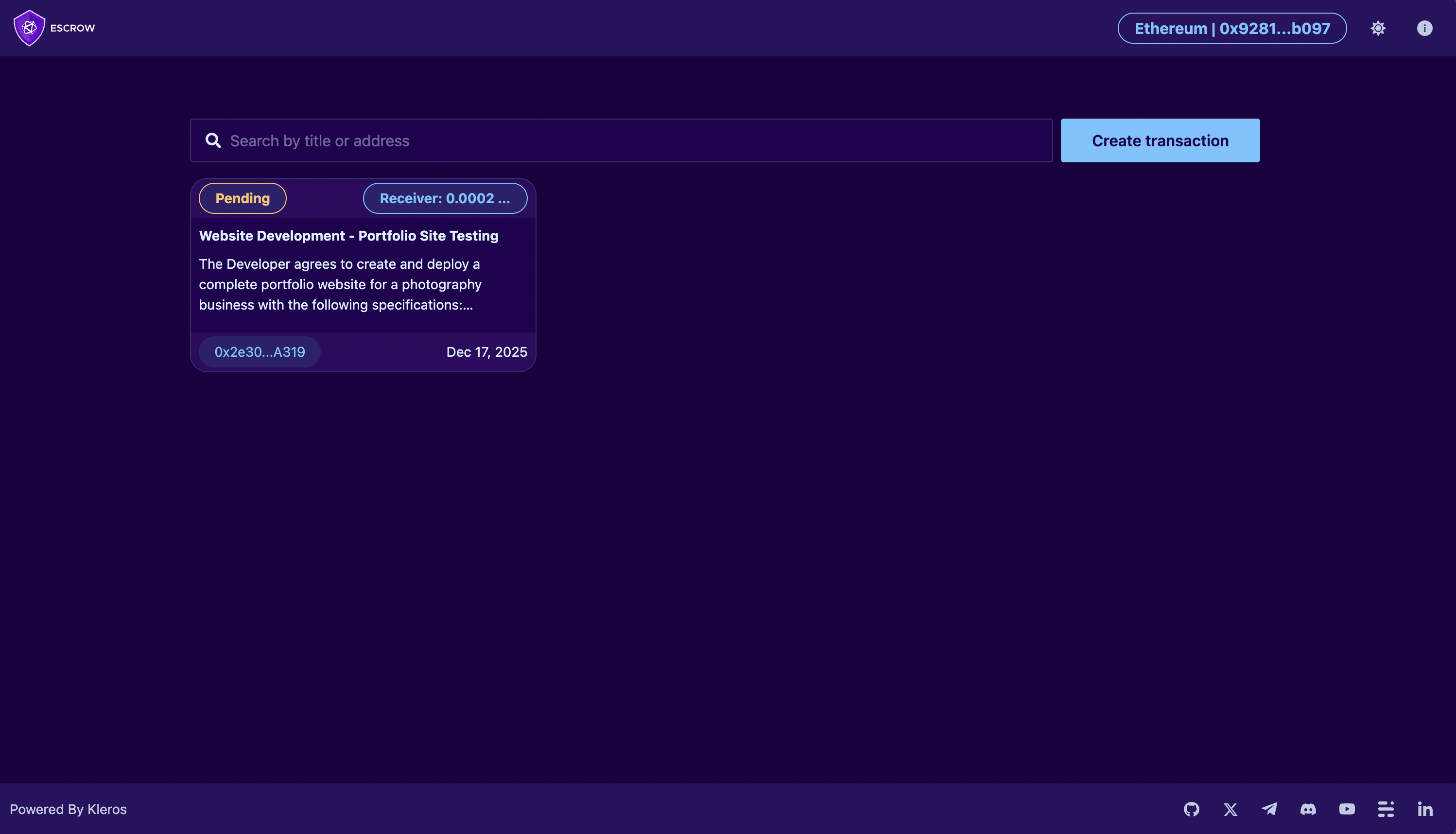 **IMPORTANT:** When you create a transaction, you will be the person who deposits funds into the escrow smart contract. The funds will be held securely until: