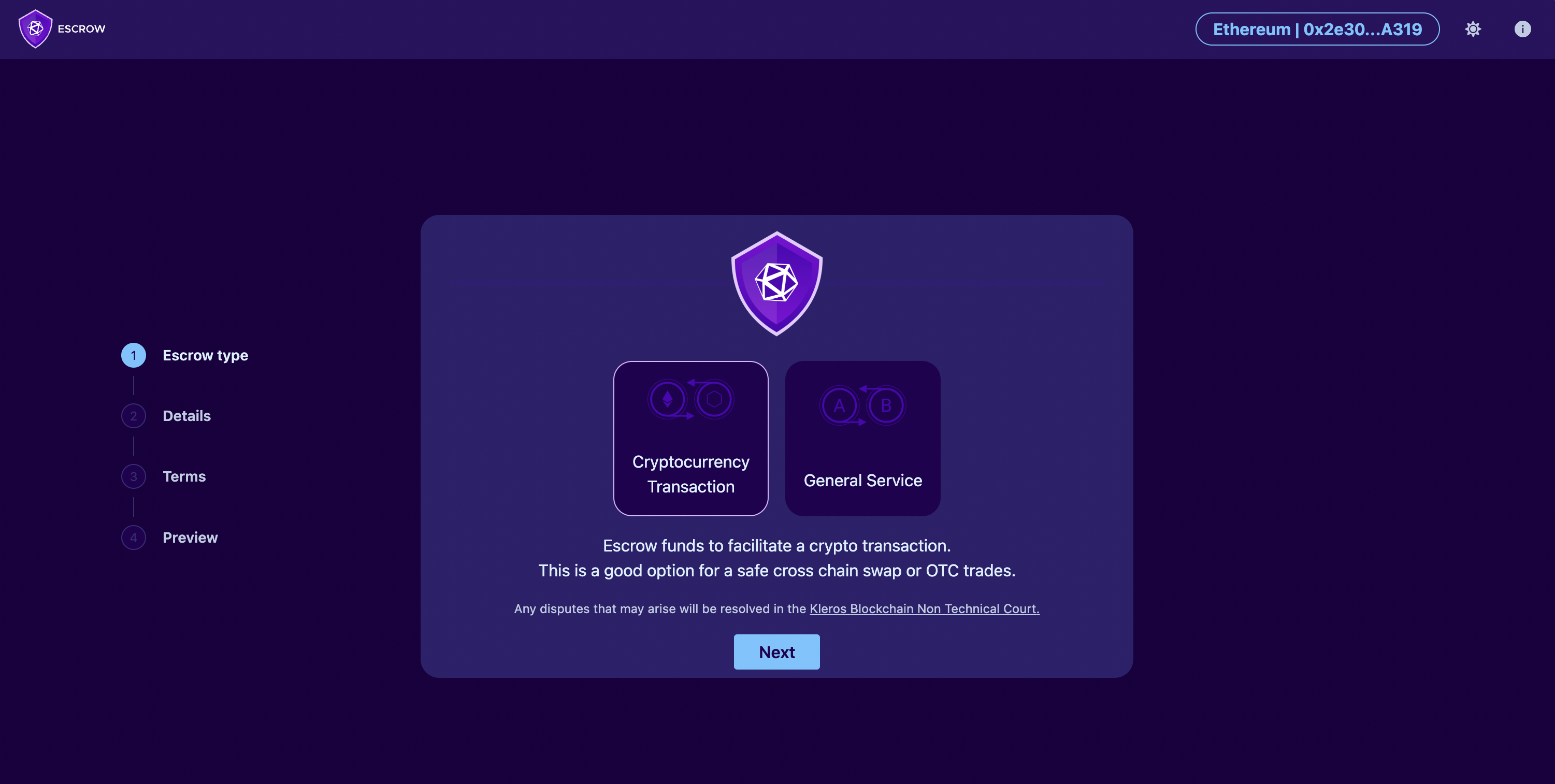 **Note:** The transaction details form is the same for both General Service and Cryptocurrecny Transaction types. The only difference between the two transaction types is which Kleros Court will handle disputes if they raise. Cryptocurrency Transaction cases will be handled by Kleros Blockchain Non Technical Court whereas those under General Service will be handled by Kleros General Court.&#x20;