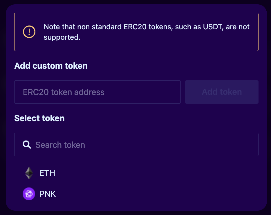 If you wish to pay with an ERC-20 token, click on the asset dropdown to select another asset. The default tokens displayed are ETH and PNK.